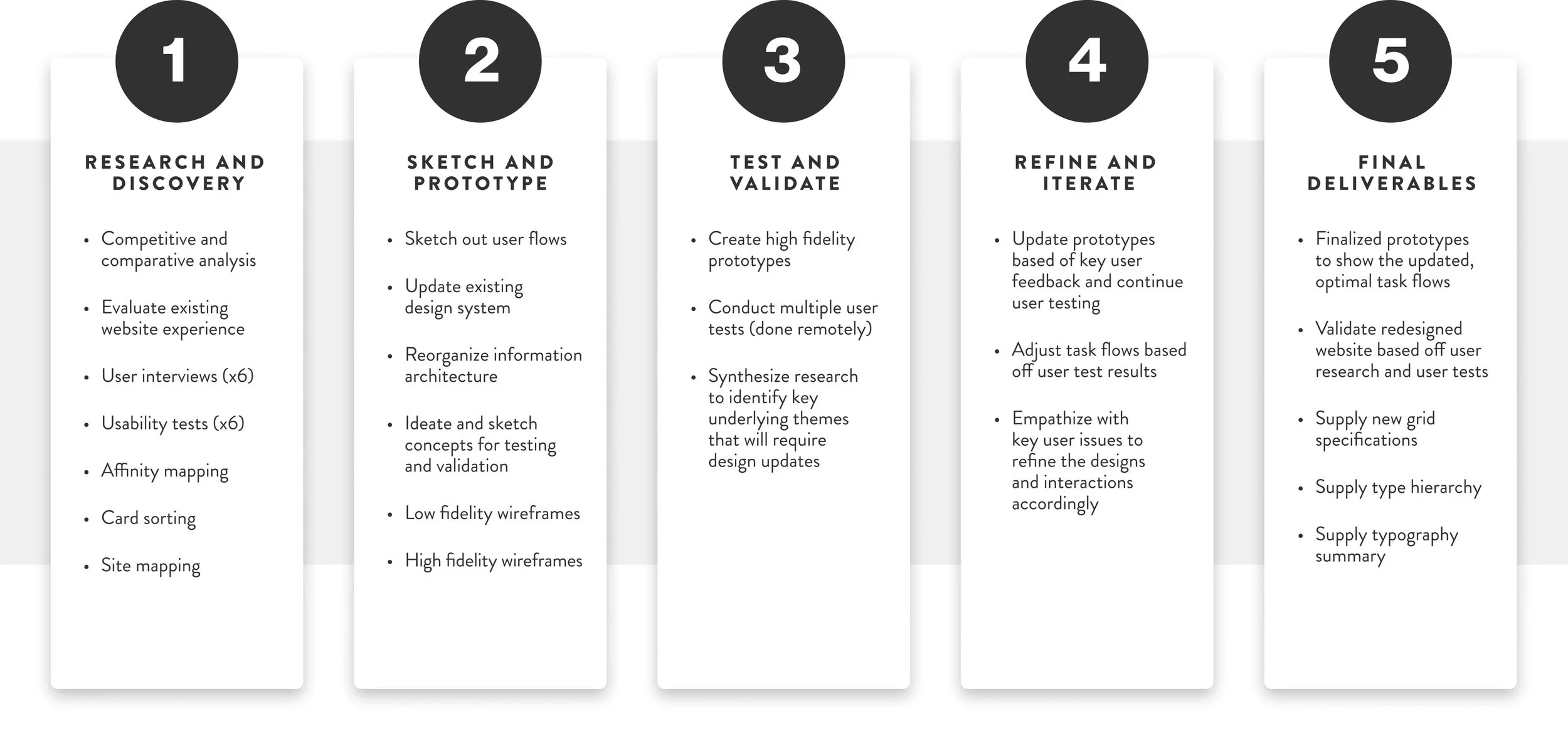 This task flow provided the foundation for developing the necessary low-fidelity wireframes for the redesign. After several rounds of ideation, I developed a wire flow to illustrate the user journey between pages when completing this core task.